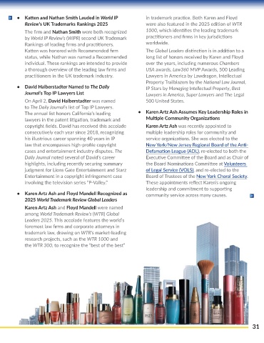 •  Katten and Nathan Smith Lauded in World IP               in trademark practice. Both Karen and Floyd