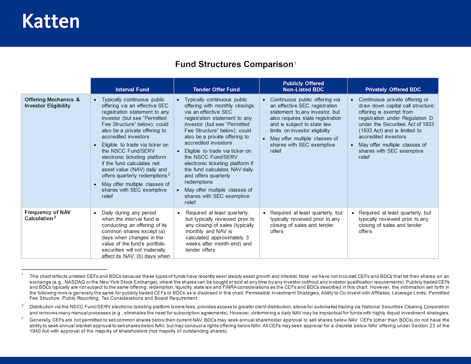 Katten advises fund sponsors and other market participants on structuring, registering and operating CEFs, including interval funds, tender offer funds, and BDCs. We understand the practical trade-offs among these vehicles and help clients design approaches that meet their fundraising goals while navigating complex regulatory regimes.