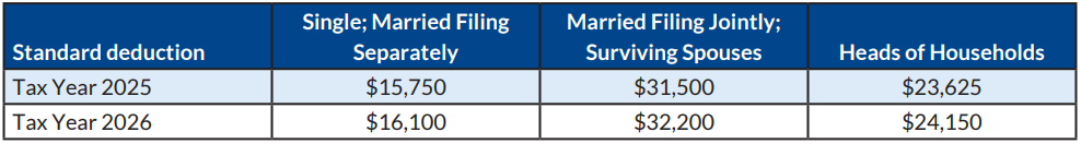 - Standard Deduction: The increased standard deduction is permanently extended and enhanced. Taxpayers aged 65 and older receive an additional $6,000 through 2028. The increased standard deduction will be indexed for inflation beginning in 2027.